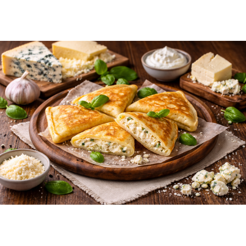 4 Cheese Benderiki are thin crepes folded and generously stuffed with a creamy four-cheese filling, then pan-fried until golden and lightly crisp on the outside while remaining soft and tender inside. The crepe batter is prepared from premium wheat flour, cow milk, chicken eggs, butter, water, white granulated sugar and salt, creating a smooth, elastic wrapper that browns beautifully and holds the filling perfectly.