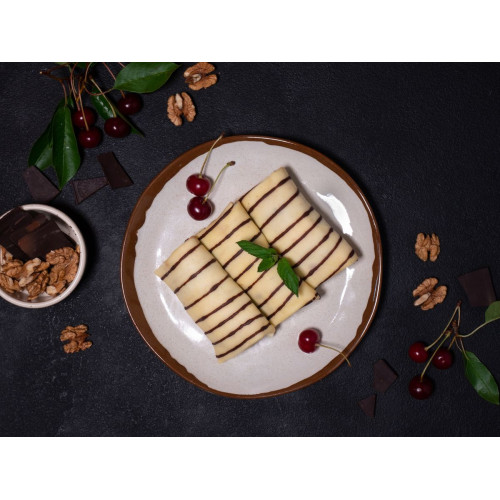 Cherry and Chocolate Crepes are delicate thin pancakes with a rich dessert-style filling. The batter is prepared on cow’s milk (34%) with premium wheat flour (11%), butter, corn flour (2%) and chicken eggs (11%), giving the crepes a soft, elastic texture and a gentle creamy taste.