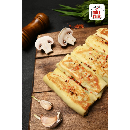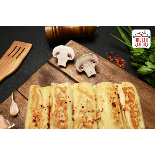 Halal Chicken and Mushroom Crepes are thin, delicate pancakes with a hearty, savory filling – perfect for a quick hot meal or appetizer. The crepe batter is made from cow milk, premium wheat flour, chicken eggs, butter, water, sugar and salt, which gives the pancakes a soft, elastic texture and a light golden colour after frying.