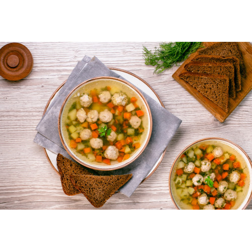 Meatball Soup is a ready-to-cook frozen soup mix for quick, home-style lunches and dinners. The blend includes potatoes, carrots, onion, herbs and minced pork with egg, salt and pepper, forming tender meatballs right in the pot and a rich, aromatic broth with vegetables.
